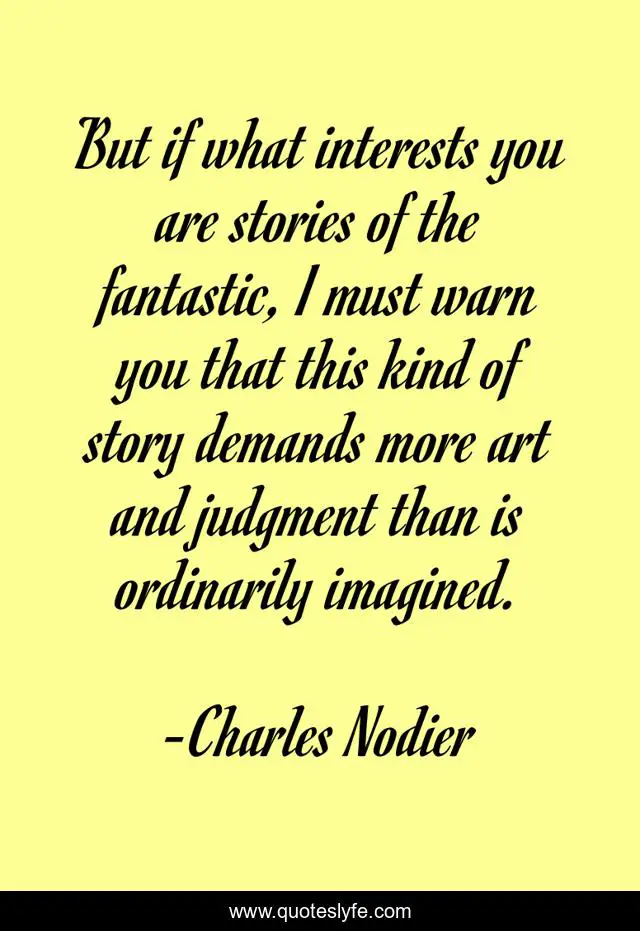 This page presents the quote "But if what interests you are stories of the fantastic, I must warn you that this kind of story demands more art and judgment than is ordinarily imagined.". Author of this quote is Charles Nodier. This quote is about fantastic, art, horror, writing, fantasy, writers, supernatural, genre,.
