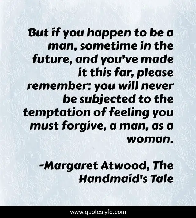 This page presents the quote "But if you happen to be a man, sometime in the future, and you've made it this far, please remember: you will never be subjected to the temptation of feeling you must forgive, a man, as a woman.". Author of this quote is Margaret Atwood, The Handmaid's Tale. .