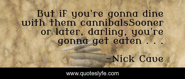 This page presents the quote "But if you're gonna dine with them cannibalsSooner or later, darling, you're gonna get eaten . . .". Author of this quote is Nick Cave. This quote is about cannibalism, eating, risk, cannibals, company, foolishness, dining, food, risk-taking,.