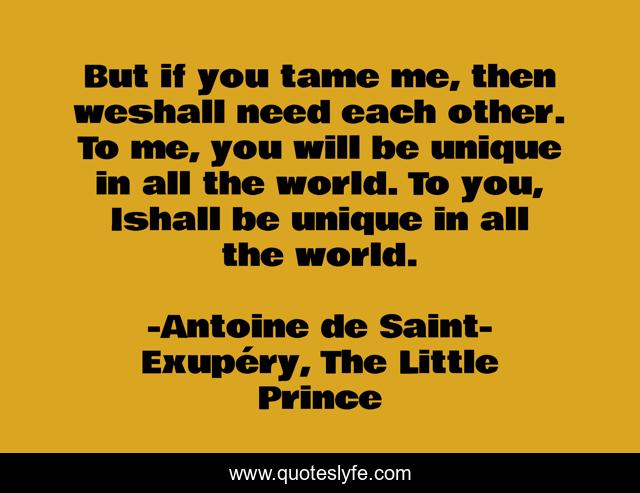 This page presents the quote "But if you tame me, then weshall need each other. To me, you will be unique in all the world. To you, Ishall be unique in all the world.". Author of this quote is Antoine de Saint-Exupéry, The Little Prince. This quote is about me, need, world,.