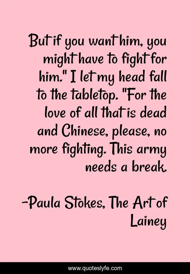 This page presents the quote "But if you want him, you might have to fight for him." I let my head fall to the tabletop. "For the love of all that is dead and Chinese, please, no more fighting. This army needs a break.". Author of this quote is Paula Stokes, The Art of Lainey. This quote is about break, love, fighting, affection, army,.