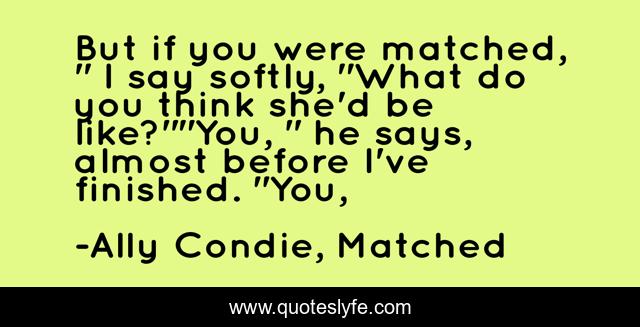 This page presents the quote "But if you were matched, " I say softly, "What do you think she'd be like?""You, " he says, almost before I've finished. "You, ". Author of this quote is Ally Condie, Matched. This quote is about beautiful, lovers, love, beauty, matches, cassia, loving, ky, affection,.