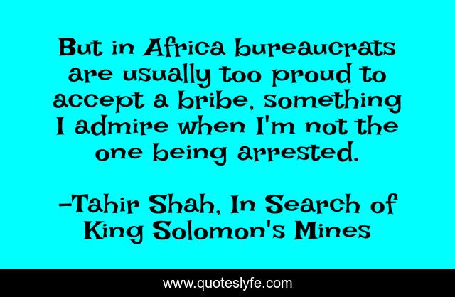 This page presents the quote "But in Africa bureaucrats are usually too proud to accept a bribe, something I admire when I'm not the one being arrested.". Author of this quote is Tahir Shah, In Search of King Solomon's Mines. This quote is about bureaucracy, bribery, pride, africa,.