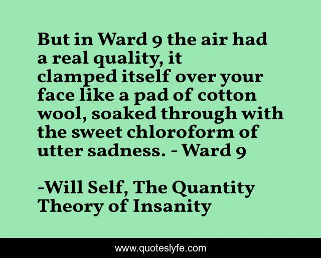 This page presents the quote "But in Ward 9 the air had a real quality, it clamped itself over your face like a pad of cotton wool, soaked through with the sweet chloroform of utter sadness. - Ward 9". Author of this quote is Will Self, The Quantity Theory of Insanity. This quote is about depressing, oppression, insanity,.