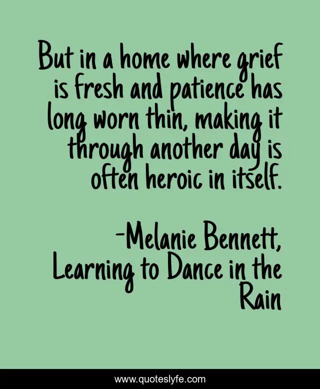 This page presents the quote "But in a home where grief is fresh and patience has long worn thin, making it through another day is often heroic in itself.". Author of this quote is Melanie Bennett, Learning to Dance in the Rain. This quote is about family-relationships, caregiver, special-needs, autism, grief-and-loss,.