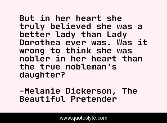 This page presents the quote "But in her heart she truly believed she was a better lady than Lady Dorothea ever was. Was it wrong to think she was nobler in her heart than the true nobleman's daughter?". Author of this quote is Melanie Dickerson, The Beautiful Pretender. This quote is about heart, young-adult, young-adult-romance, clean-romance, christian-fiction,.
