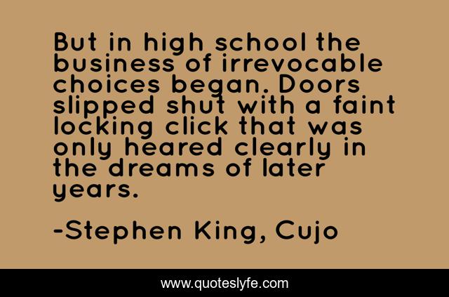 This page presents the quote "But in high school the business of irrevocable choices began. Doors slipped shut with a faint locking click that was only heared clearly in the dreams of later years.". Author of this quote is Stephen King, Cujo. .