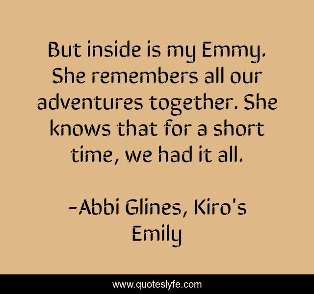 This page presents the quote "But inside is my Emmy. She remembers all our adventures together. She knows that for a short time, we had it all.". Author of this quote is Abbi Glines, Kiro's Emily. This quote is about adoration, love, soulmates, romance, devotion, affection,.