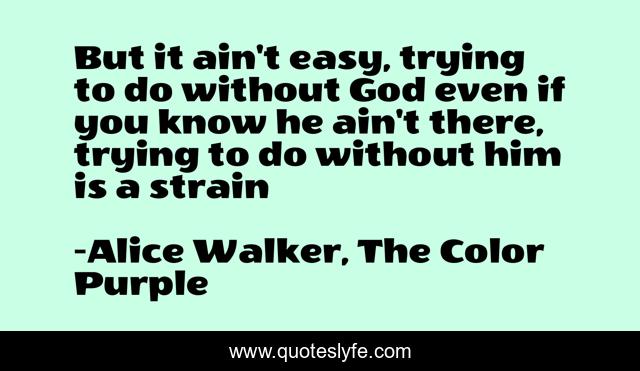 This page presents the quote "But it ain't easy, trying to do without God even if you know he ain't there, trying to do without him is a strain". Author of this quote is Alice Walker, The Color Purple. .