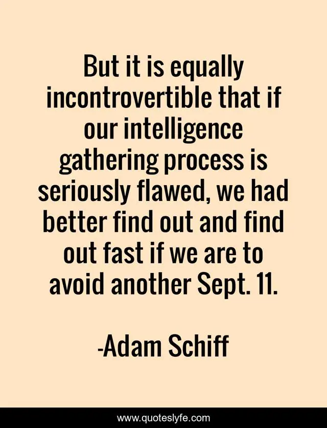 This page presents the quote "But it is equally incontrovertible that if our intelligence gathering process is seriously flawed, we had better find out and find out fast if we are to avoid another Sept. 11.". Author of this quote is Adam Schiff. This quote is about better, seriously, fast,.
