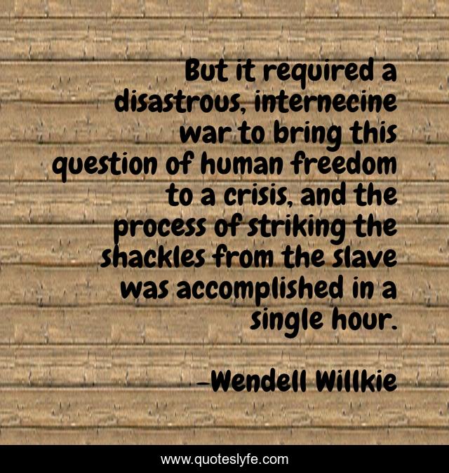 This page presents the quote "But it required a disastrous, internecine war to bring this question of human freedom to a crisis, and the process of striking the shackles from the slave was accomplished in a single hour.". Author of this quote is Wendell Willkie. This quote is about freedom, crisis, human,.