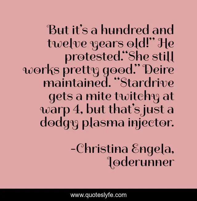This page presents the quote "But it’s a hundred and twelve years old!” He protested.“She still works pretty good.” Deire maintained. “Stardrive gets a mite twitchy at warp 4, but that’s just a dodgy plasma injector.". Author of this quote is Christina Engela, Loderunner. This quote is about stardrive, good, twitchy, deire, at, maintained, she, injector, plasma,.