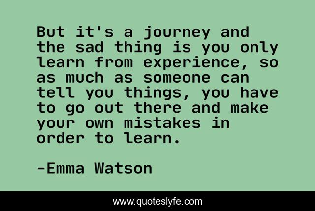 This page presents the quote "But it's a journey and the sad thing is you only learn from experience, so as much as someone can tell you things, you have to go out there and make your own mistakes in order to learn.". Author of this quote is Emma Watson. This quote is about mistakes, journey, sad,.