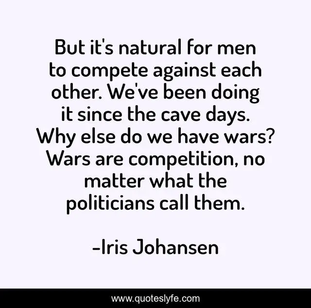This page presents the quote "But it's natural for men to compete against each other. We've been doing it since the cave days. Why else do we have wars? Wars are competition, no matter what the politicians call them.". Author of this quote is Iris Johansen. This quote is about men, war, competition,.