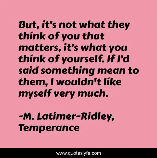 This page presents the quote "But, it’s not what they think of you that matters, it’s what you think of yourself. If I’d said something mean to them, I wouldn't like myself very much.". Author of this quote is M. Latimer-Ridley, Temperance. This quote is about self, personality,.