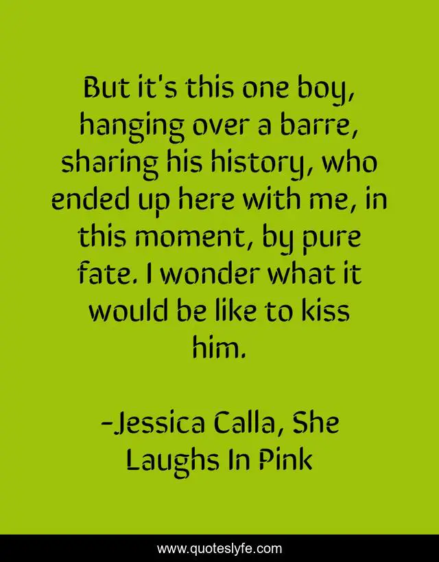 This page presents the quote "But it's this one boy, hanging over a barre, sharing his history, who ended up here with me, in this moment, by pure fate. I wonder what it would be like to kiss him.". Author of this quote is Jessica Calla, She Laughs In Pink. This quote is about ballet, love, fate, dance, romance, kiss, affection,.