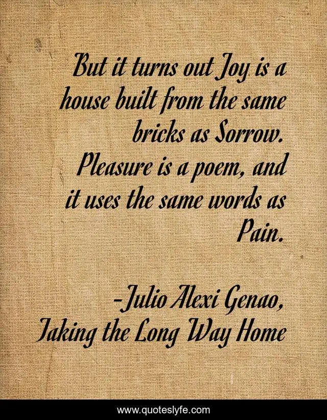 This page presents the quote "But it turns out Joy is a house built from the same bricks as Sorrow. Pleasure is a poem, and it uses the same words as Pain.". Author of this quote is Julio Alexi Genao, Taking the Long Way Home. This quote is about emotion, loss, pain, joy, grief, pleasure,.