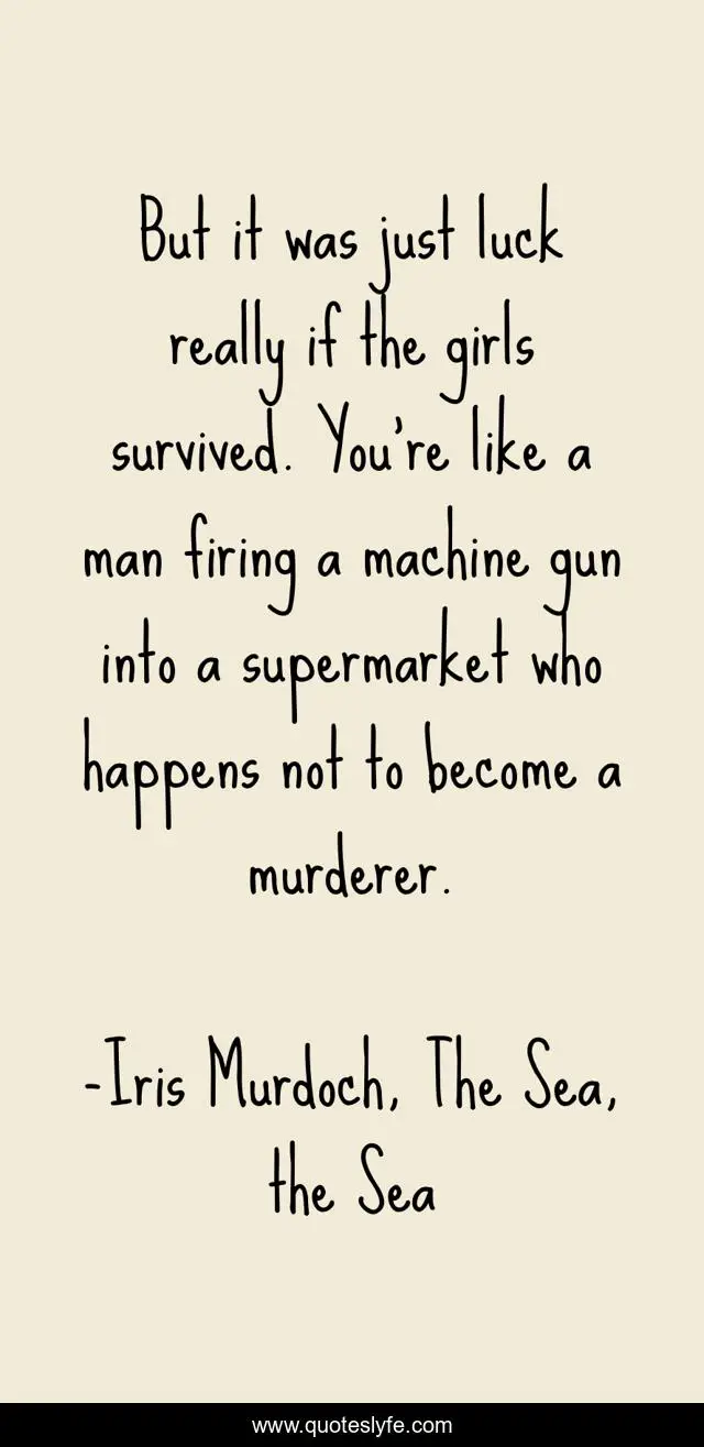 This page presents the quote "But it was just luck really if the girls survived. You're like a man firing a machine gun into a supermarket who happens not to become a murderer.". Author of this quote is Iris Murdoch, The Sea, the Sea. This quote is about murder, love, unrequited-love, affection, women,.
