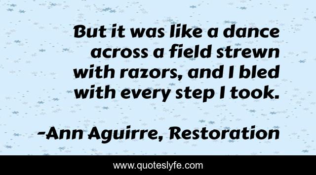 This page presents the quote "But it was like a dance across a field strewn with razors, and I bled with every step I took.". Author of this quote is Ann Aguirre, Restoration. This quote is about bleeding, razors, metaphor,.