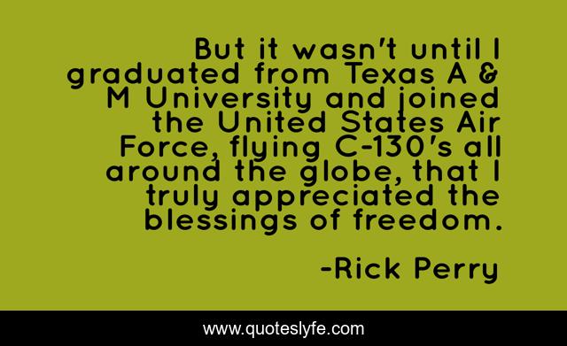 This page presents the quote "But it wasn't until I graduated from Texas A & M University and joined the United States Air Force, flying C-130's all around the globe, that I truly appreciated the blessings of freedom.". Author of this quote is Rick Perry. This quote is about flying, air force, blessings,.