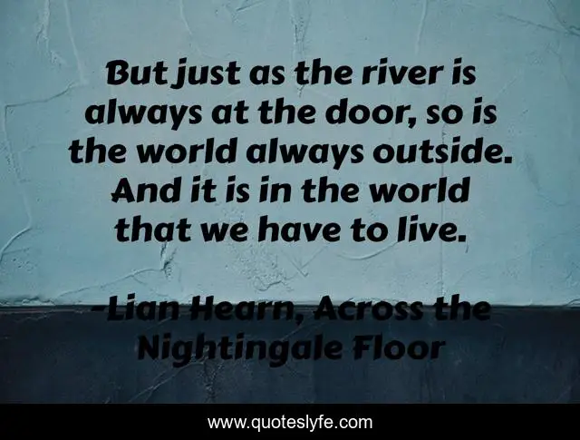 This page presents the quote "But just as the river is always at the door, so is the world always outside. And it is in the world that we have to live.". Author of this quote is Lian Hearn, Across the Nightingale Floor. This quote is about world, live, river,.