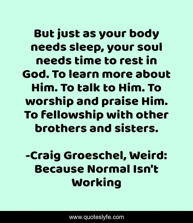 This page presents the quote "But just as your body needs sleep, your soul needs time to rest in God. To learn more about Him. To talk to Him. To worship and praise Him. To fellowship with other brothers and sisters.". Author of this quote is Craig Groeschel, Weird: Because Normal Isn't Working. This quote is about and, body, needs, learn, him, brothers, priase, to, god,.