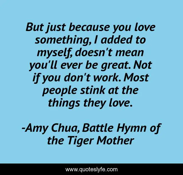 This page presents the quote "But just because you love something, I added to myself, doesn't mean you'll ever be great. Not if you don't work. Most people stink at the things they love.". Author of this quote is Amy Chua, Battle Hymn of the Tiger Mother. This quote is about enthusiasm, inspirational, truth,.