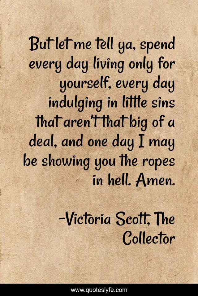 This page presents the quote "But let me tell ya, spend every day living only for yourself, every day indulging in little sins that aren’t that big of a deal, and one day I may be showing you the ropes in hell. Amen.". Author of this quote is Victoria Scott, The Collector. .