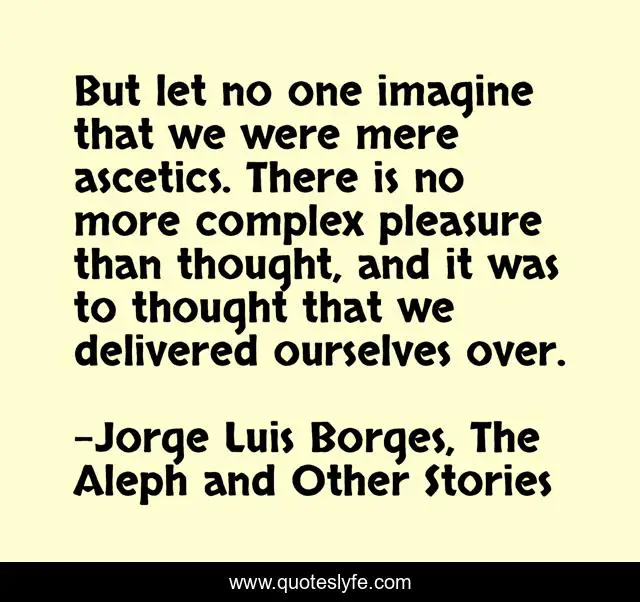 This page presents the quote "But let no one imagine that we were mere ascetics. There is no more complex pleasure than thought, and it was to thought that we delivered ourselves over.". Author of this quote is Jorge Luis Borges, The Aleph and Other Stories. This quote is about thought, jorge-luis-borges, pleasure,.