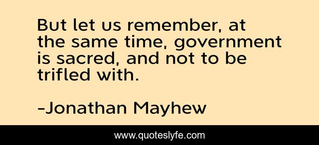This page presents the quote "But let us remember, at the same time, government is sacred, and not to be trifled with.". Author of this quote is Jonathan Mayhew. This quote is about remember, sacred, time,.