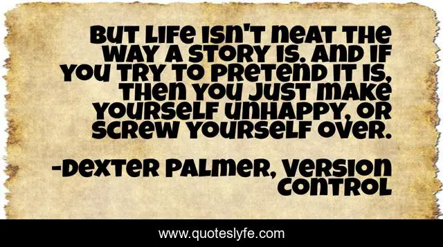 This page presents the quote "But life isn't neat the way a story is. And if you try to pretend it is, then you just make yourself unhappy, or screw yourself over.". Author of this quote is Dexter Palmer, Version Control. This quote is about life, story, fiction, version-control, dexter-palmer, reality-vs-fantasy,.