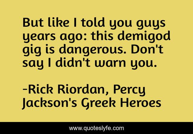 This page presents the quote "But like I told you guys years ago: this demigod gig is dangerous. Don't say I didn't warn you.". Author of this quote is Rick Riordan, Percy Jackson's Greek Heroes. .