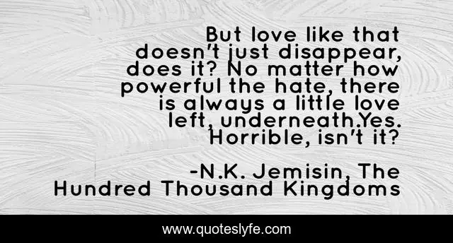 This page presents the quote "But love like that doesn't just disappear, does it? No matter how powerful the hate, there is always a little love left, underneath.Yes. Horrible, isn't it?". Author of this quote is N.K. Jemisin, The Hundred Thousand Kingdoms. This quote is about hate, love, affection, resentment,.