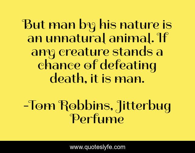 This page presents the quote "But man by his nature is an unnatural animal. If any creature stands a chance of defeating death, it is man.". Author of this quote is Tom Robbins, Jitterbug Perfume. This quote is about immortality, death,.