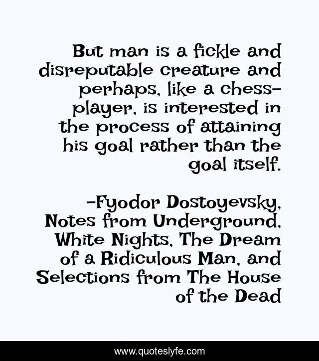 This page presents the quote "But man is a fickle and disreputable creature and perhaps, like a chess-player, is interested in the process of attaining his goal rather than the goal itself.". Author of this quote is Fyodor Dostoyevsky, Notes from Underground, White Nights, The Dream of a Ridiculous Man, and Selections from The House of the Dead. This quote is about russian, 19th-century, russian-literature, fiction,.