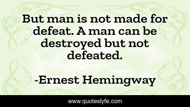 This page presents the quote "But man is not made for defeat. A man can be destroyed but not defeated.". Author of this quote is Ernest Hemingway. This quote is about man, defeated, defeat,.