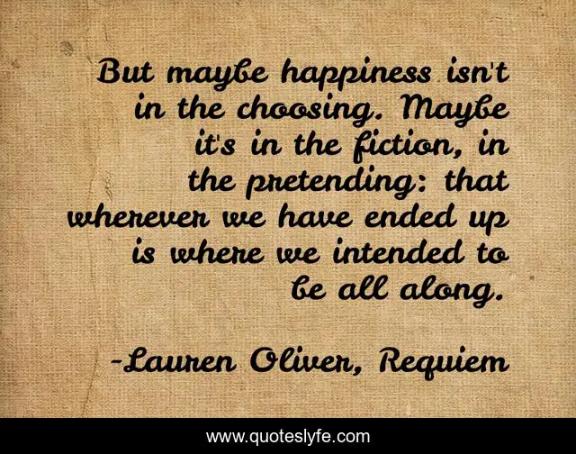 This page presents the quote "But maybe happiness isn't in the choosing. Maybe it's in the fiction, in the pretending: that wherever we have ended up is where we intended to be all along.". Author of this quote is Lauren Oliver, Requiem. This quote is about happiness, pretending,.