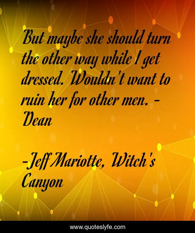 This page presents the quote "But maybe she should turn the other way while I get dressed. Wouldn't want to ruin her for other men. - Dean". Author of this quote is Jeff Mariotte, Witch's Canyon. This quote is about mystery, horror, tv-tie-in, sci-fi,.