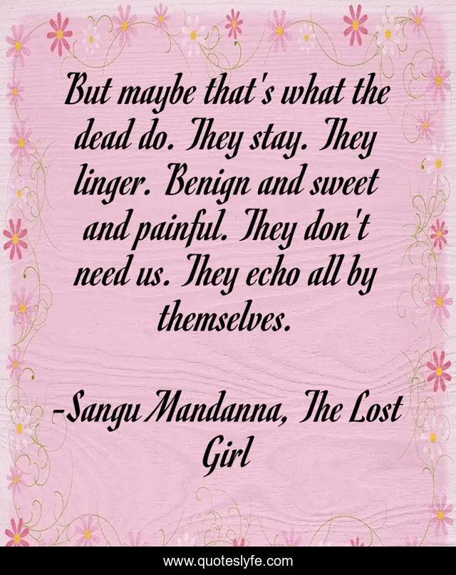 This page presents the quote "But maybe that's what the dead do. They stay. They linger. Benign and sweet and painful. They don't need us. They echo all by themselves.". Author of this quote is Sangu Mandanna, The Lost Girl. This quote is about dead, lost, memory,.
