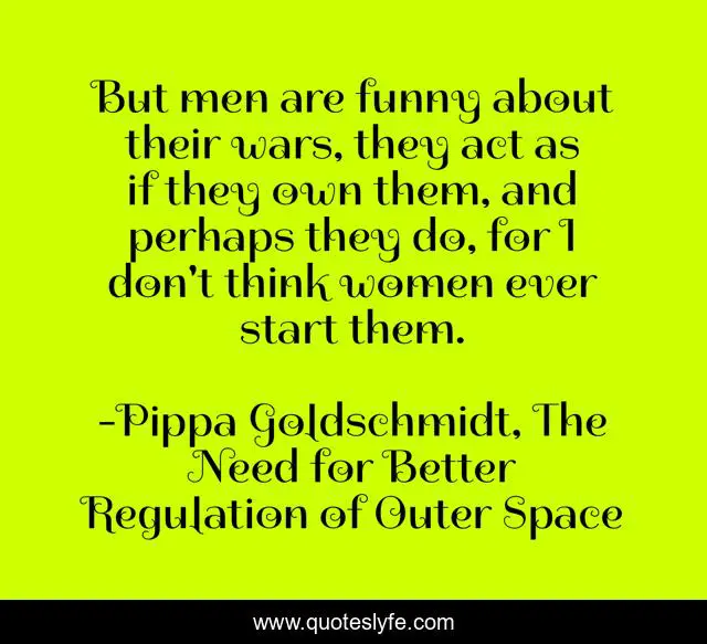 This page presents the quote "But men are funny about their wars, they act as if they own them, and perhaps they do, for I don't think women ever start them.". Author of this quote is Pippa Goldschmidt, The Need for Better Regulation of Outer Space. This quote is about science, men, scientist, short-story, war, women,.