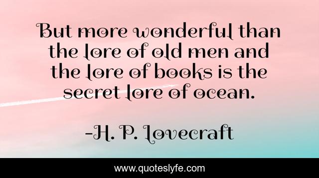 This page presents the quote "But more wonderful than the lore of old men and the lore of books is the secret lore of ocean.". Author of this quote is H. P. Lovecraft. This quote is about secret, men, ocean,.