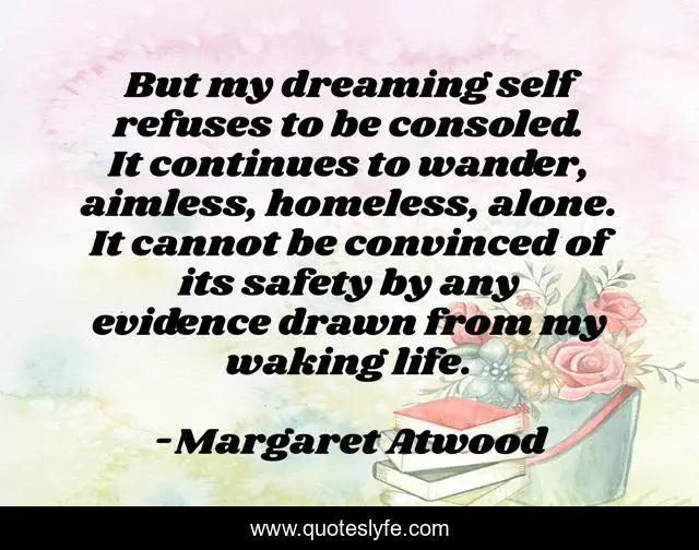This page presents the quote "But my dreaming self refuses to be consoled. It continues to wander, aimless, homeless, alone. It cannot be convinced of its safety by any evidence drawn from my waking life.". Author of this quote is Margaret Atwood. This quote is about soul, dreams,.