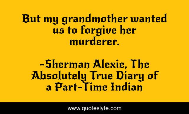 This page presents the quote "But my grandmother wanted us to forgive her murderer.". Author of this quote is Sherman Alexie, The Absolutely True Diary of a Part-Time Indian. This quote is about grandmother, murderer, forgive,.