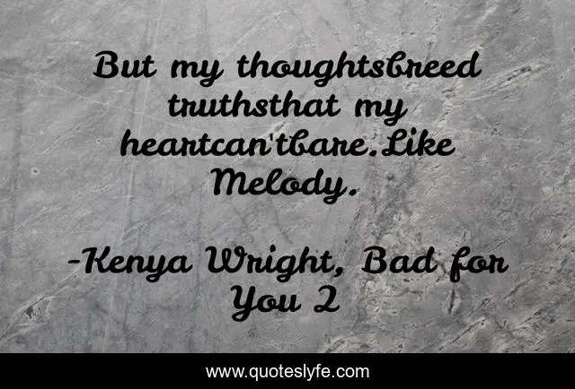 This page presents the quote "But my thoughtsbreed truthsthat my heartcan'tbare.Like Melody.". Author of this quote is Kenya Wright, Bad for You 2. This quote is about dark, sequel, romance, wright, alpha, kenya, bad-for-you-2,.