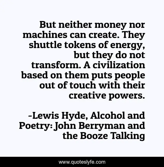 This page presents the quote "But neither money nor machines can create. They shuttle tokens of energy, but they do not transform. A civilization based on them puts people out of touch with their creative powers.". Author of this quote is Lewis Hyde, Alcohol and Poetry: John Berryman and the Booze Talking. This quote is about culture, creativity, poetry, machines, money,.