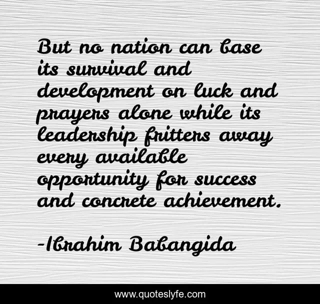 This page presents the quote "But no nation can base its survival and development on luck and prayers alone while its leadership fritters away every available opportunity for success and concrete achievement.". Author of this quote is Ibrahim Babangida. This quote is about alone, success, achievement,.