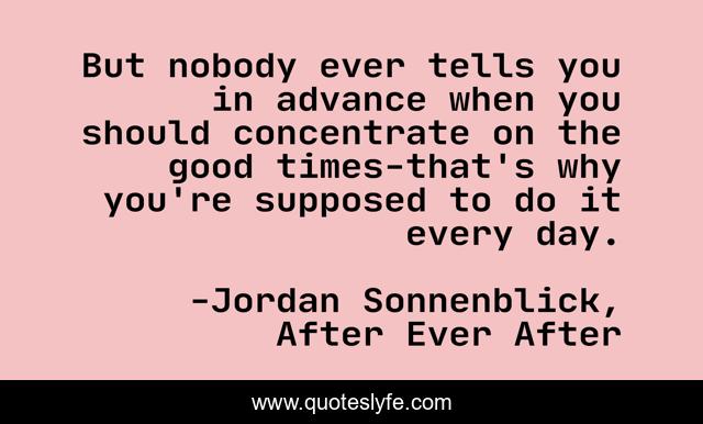 This page presents the quote "But nobody ever tells you in advance when you should concentrate on the good times-that's why you're supposed to do it every day.". Author of this quote is Jordan Sonnenblick, After Ever After. This quote is about good-times, appreciation, enjoy-life,.