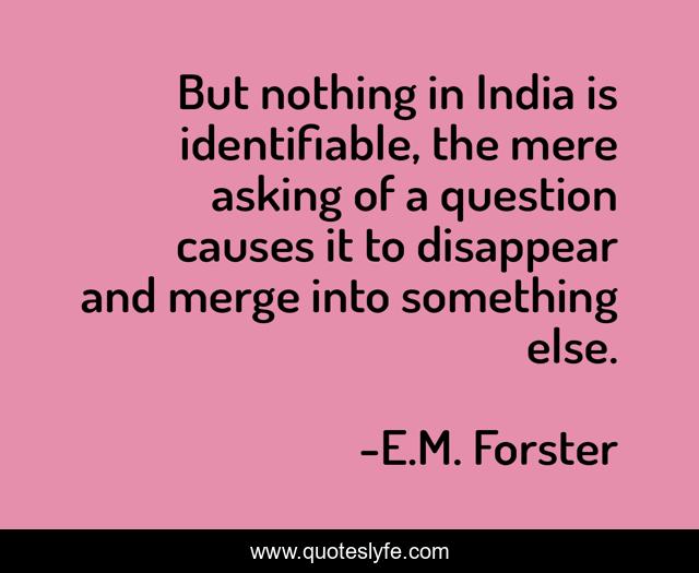 This page presents the quote "But nothing in India is identifiable, the mere asking of a question causes it to disappear and merge into something else.". Author of this quote is E.M. Forster. This quote is about questions-and-answers, india, knowledge,.