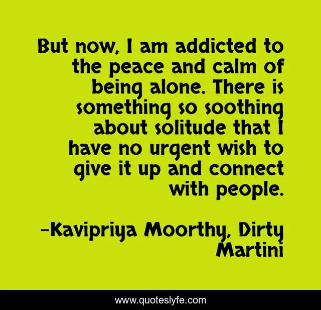 This page presents the quote "But now, I am addicted to the peace and calm of being alone. There is something so soothing about solitude that I have no urgent wish to give it up and connect with people.". Author of this quote is Kavipriya Moorthy, Dirty Martini. This quote is about peace, people, solitude, dirty-martini, calm, alone,.