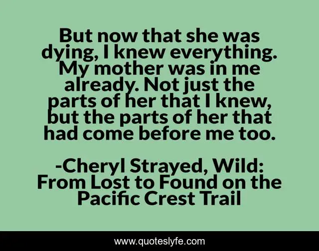 This page presents the quote "But now that she was dying, I knew everything. My mother was in me already. Not just the parts of her that I knew, but the parts of her that had come before me too.". Author of this quote is Cheryl Strayed, Wild: From Lost to Found on the Pacific Crest Trail. This quote is about loss, life, love, grief, mom, mother, affection,.